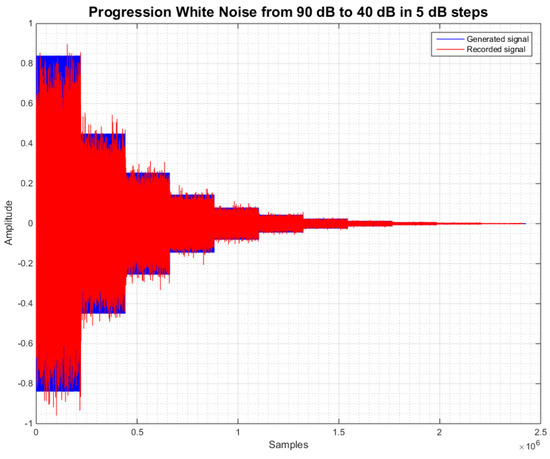 The laboratory test for checking the accuracy of the system was carried out with an integrating sound level meter, Rion NL-05 with a flat-frequency-response UC-52 microphone, using a dodecahedron speaker and an audio amplifier connected to a software-based signal generator. These tests were performed in a semi-anechoic chamber. With the signal generator and the speaker, a white-noise signal was emitted and with the use of the sound level meter, it was adjusted to different gains and decibels. The readings from the sound level meter were compared with the readings of the device and results can be observed in Table 2 and in Figure 7.