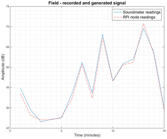 The device was also field tested, using the integrating sound level meter, Rion NL-05. The test consisted in measurements of the in periods of 1 min. Fifteen sets of 1 min were tested and compared. The device and the sound level meter were placed in the façade of a building at a height of 4 m in a residential area and in front of a street with low amount of traffic. The values obtained from the sound level meter and the Raspberry node are presented in Figure 8. The differences between the levels are attributed to the higher precision of the sound level meter in its dynamic range. The precision of the Raspberry Pi node offers enough accuracy for long-term measurements where the changes over long period of time are evaluated.