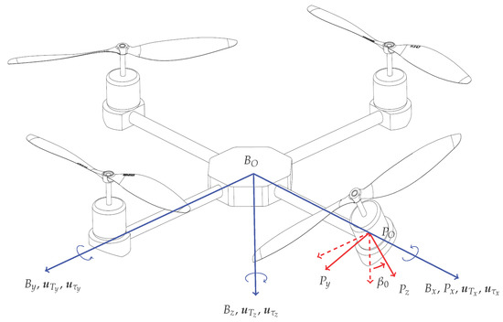 where indicates the conjugate of quaternion q; is the angular velocity of with respect to ; β is the angle between and (the subscript z indicates the z axis); and is the angular velocity of the tilting rotor about . Differentiating this expression results in the angular acceleration of the tilting rotor in , which is given in the following equation.