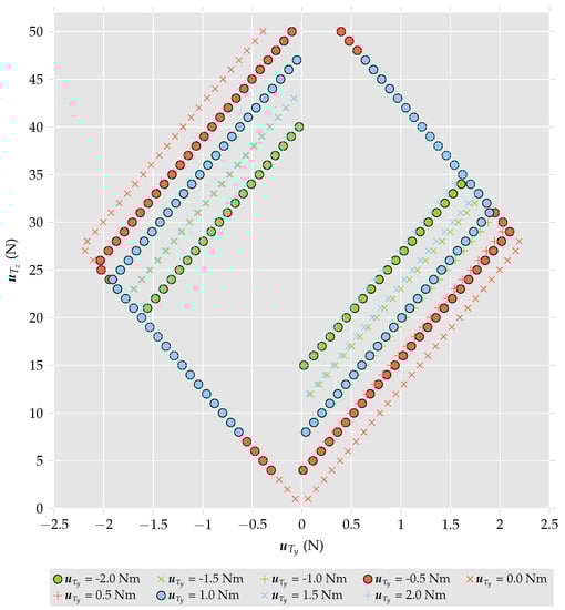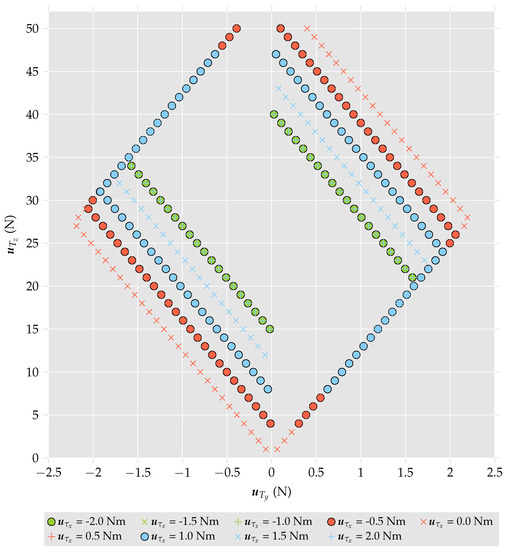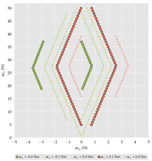 The control bandwidth can be characterised by an analysis of Equation (16). In particular, given control input constraints, the maximum and minimum achievable lateral forces, , that can be generated can be determined as a function of required vertical force, , and torques, . The results presented in Figure 2, Figure 3 and Figure 4 were calculated by setting and and increasing or decreasing until the system could no longer be solved to satisfy the control input constraints. The data points represent the maximum and minimum values of for a given set of and . The parameters , and l are presented in Table 2, along with the control input constraints and additional multirotor helicopter parameters. It should further be noted that these results are valid for operating conditions sufficiently close to the hover condition where assumptions made in Equations (4) and (9) are valid.