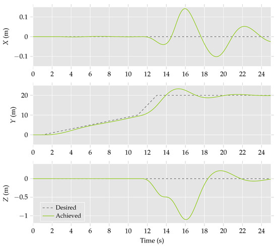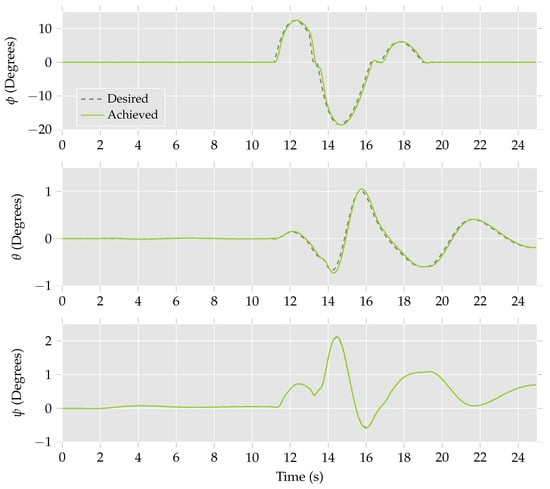 Initially, the multirotor helicopter is commanded to move in the y-direction at a rate of 1 m/s. After a period of 10 s, the multirotor helicopter is commanded to increase its velocity to 5 m/s. The complete motion is presented in Figure 5. The attitude of the multirotor helicopter during the manoeuvre is presented in Figure 6. Further, Figure 7 shows the achieved lateral force and the corresponding rotor tilt.