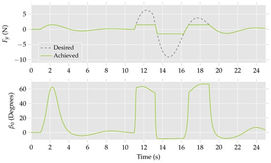 From Figure 7, it is observed that the entire desired lateral force for the initial stage of the manoeuvre can be achieved through actuating the tilting rotor only. This is reflected in Figure 6, as the roll remains unchanged despite the multirotor helicopter moving in the desired direction. During the second stage of the manoeuvre, it can be seen that actuating the only tilting rotor no longer produces the desired lateral force. Instead, the attitude of the multirotor helicopter must be utilised to achieve the desired motion. This is represented in Figure 6 as a change in the roll, ϕ, of the multirotor helicopter.