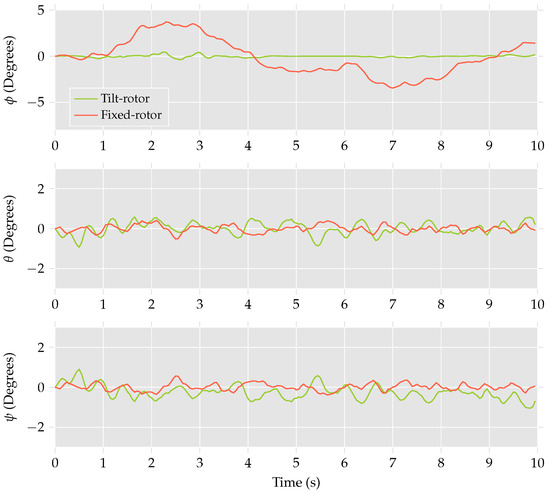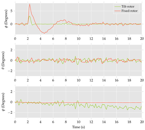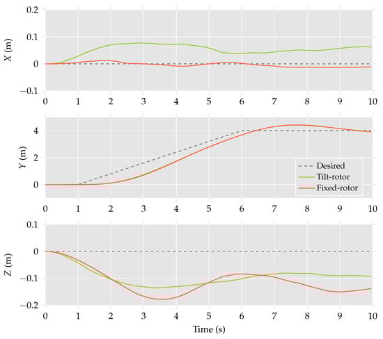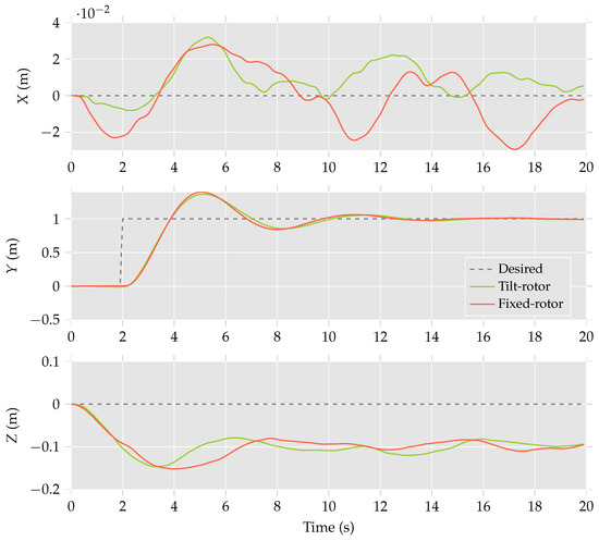 In the second experiment, the multirotor helicopter was commanded to track a step input of 1 m in the y-direction. The position and attitude of the multirotor helicopter during the second manoeuvre are presented in Figure 11 and Figure 12, respectively. As in the previous case, the differences in trajectories for the fixed and tilt-rotor are minimal. Further, it is observed that both multirotor helicopters were required to perform roll manoeuvres to track the desired position trajectory. However, the maximum roll for the tilt-rotor configuration was approximately , compared to in the case of the fixed-rotor configuration.