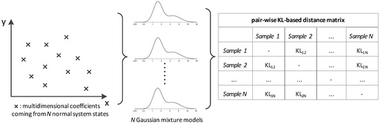 This subsection details the way the LTI coefficients are represented in the stochastic plane for achieving clustering. Here, the aim is to assess the similarity, denoted as , between the data under investigation and ones coming from the nominal state which were processed during the training of the system. This work proposes that can be estimated via Kullback–Leibler (KL) distances computed in the probabilistic space (see Figure 1). Thus, the normal state is decomposed into a group of GMMs rather than using only one universal model.