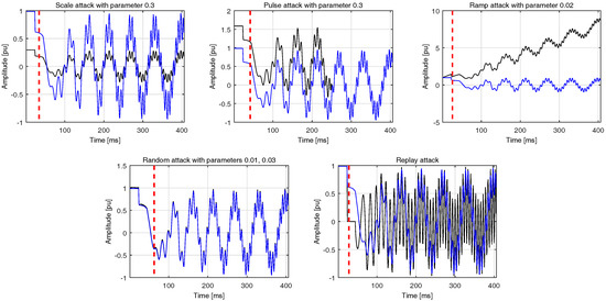 A set of the integrity attacks considered in this work. Blue coloured lines denote the nominal datastream while the ones affected by an attack are shown in black. The attacks start at and the dashed vertical line denotes the time instant in which it is detected by the proposed algorithm. The detection delays are 34 ms, 42 ms, 26 ms, 63 ms, and 28 ms with respect to scale, pulse, ramp, random and replay attacks.