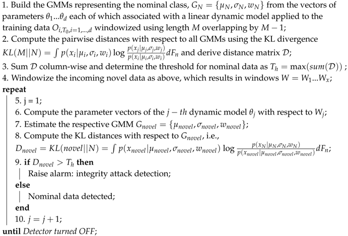Thus, the distance matrix is derived with respect to every nominal system state as depicted in Figure 1. This scheme can be parallelized to a logic where the distance metric is the KL divergence. is summed column-wise and the maximum value comprises the threshold which discriminates between the normal vs. the rest of the data samples. Algorithm 1 demonstrates the process leading to integrity attack detection while a representative paradigm is depicted in Figure 2. The following section describes the experimental set-up and analyses the results.