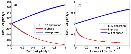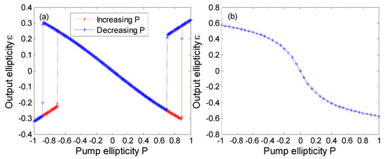 Output ellipticity vs. pump ellipticity for vertical-cavity surface-emitting laser 1 (VCSEL1) with (a) ; and (b) .