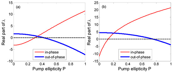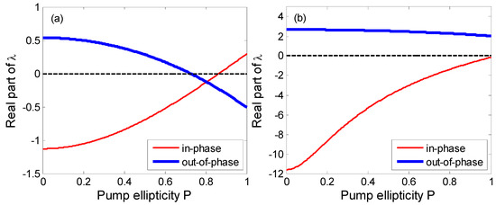 Real parts of eigenvalues vs. pump ellipticity for VCSEL2 with (a) ; and (b) .