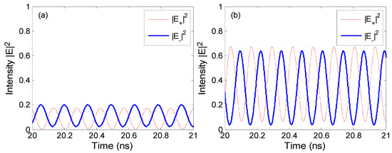 Circularly polarized intensity components vs. time for VCSEL1 with (a) , ; and (b) , .