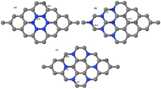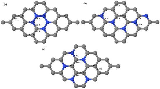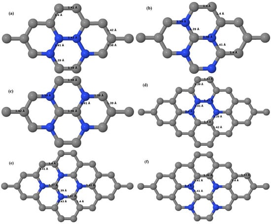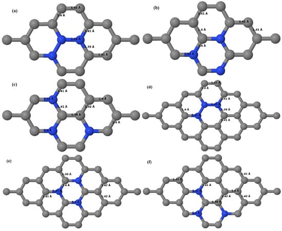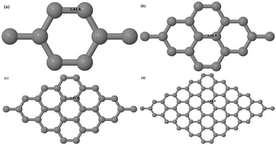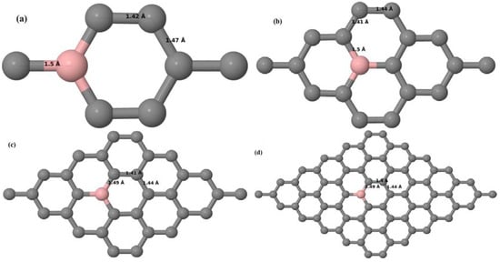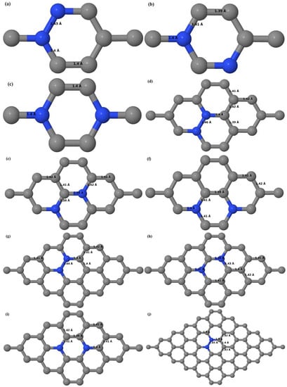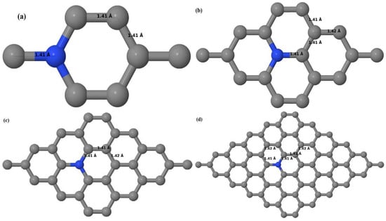 Figure 16a–d depict the optimized geometries of 2 × 2, 3 × 3, 4 × 4, and 6 × 6 graphene supercells doped with one N atom. The small covalent radius of N compared to that of C results in the reduction of the C–N bond length to 1.41 Å for 2 × 2, 3 × 3, 4 × 4, and 6 × 6 graphene supercells doped with one N atom (Figure 16a–d), consistent with that reported in []. The adjoining C–C bond length was reduced from 1.42 Å to 1.41 Å in graphene systems doped with one N atom (Figure 16a–d) to preserve the planar geometry.