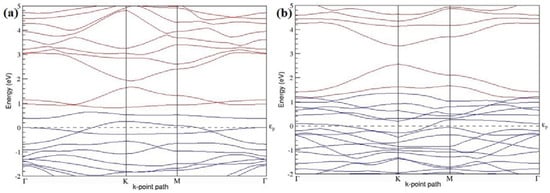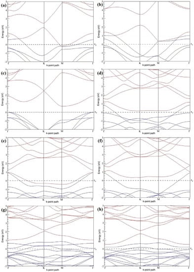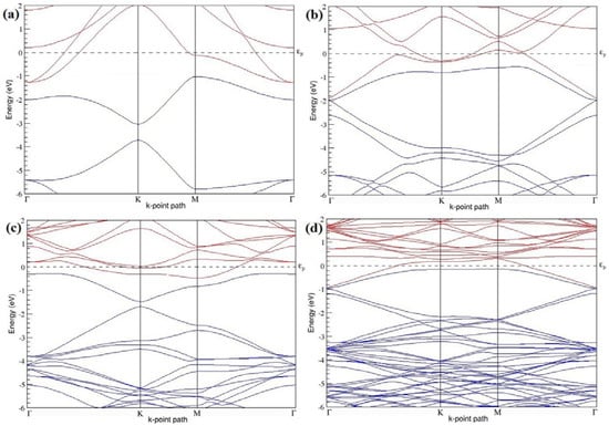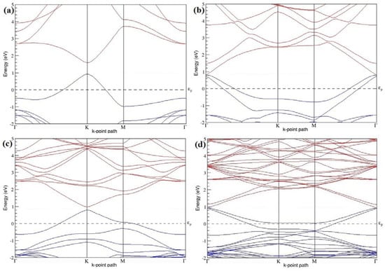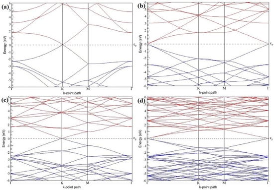 The band structures of the PG sheets (Figure 2a–d) along the high symmetry points (Γ-K-M-Γ) of the hexagonal Brillouin zone of graphene, which exhibit zero energy band gap and linear in-plane dispersion around the Fermi level, are found to be in good agreement with the reported literature [], which presents the reliability of the employed calculation method. In the band structures of 2 × 2 and 4 × 4 graphene supercells, the top of the valence band and the bottom of the conduction band degenerate at the K-point as seen in Figure 2a,c, whereas, in 3 × 3 and 6 × 6 supercells, the degeneracy is observed at the Γ-point, as presented in Figure 2b,d. This is in accordance with the previous reports that the Dirac point moves into the Γ-point, when the supercells are dimensions of three (3 × 3, 6 × 6, 9 × 9 supercells, etc.) [].