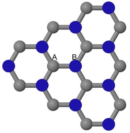 As graphene’s honeycomb lattice consists of two interpenetrating triangular sublattices as shown in Figure 5, several isomers of the same doping concentration are possible. A few isomers with configurations of three doping sites, i.e., when all the dopant atoms are adjacent, when they are at same sublattice positions (all in either sublattice “A” or in sublattice “B”), and when they are at different sublattice positions (in sublattice “A” and “B”), are only presented here for simplicity, as all possible doping configurations of any atomic doping concentration will fall under these three categories only. Hence, the cohesive energies and the band structures of the above-mentioned geometries corresponding to the same doping concentration are calculated to analyze the influence of the dopant sites on the stabilities and the band gap values.