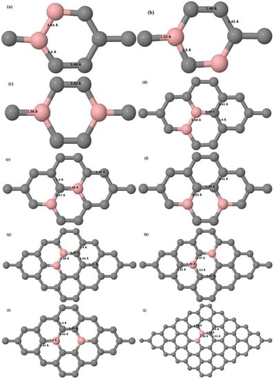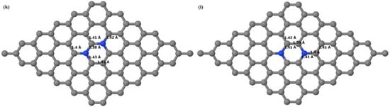 The changes in the bond lengths after B-doping can be read from the optimized structures shown in Figure 3, Figure 6, Figure 8, Figure 10, Figure 12, and Figure 14. In all B-doped graphene systems, the bond lengths are adjusted to retain the planar geometry, i.e., with long C–B bonds and relatively short adjacent C–C bonds based on the number and location of B atoms in graphene supercells. The placement of B atoms at adjacent locations results in large B–B bond lengths in B-doped graphene systems. The large B–B bond lengths observed for the configurations with B atoms at adjacent locations (Figure 6a,d,g,j, Figure 8a,d, Figure 10a,d, Figure 12a, and Figure 14a could be ascribed to the large covalent radius of B compared to the host C atoms. The changes in the bond lengths after N-doping can be read from the optimized structures shown in Figure 16, Figure 18, Figure 20, Figure 22, Figure 24, and Figure 26. The planar configuration is also maintained in all N-doped graphene systems by adjusting the associated bond lengths, i.e., with short C–N and C–C bond lengths.