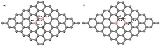 Figure 6a–l depict the optimized geometries of the 2 × 2, 3 × 3, 4 × 4, and 6 × 6 graphene supercells doped with two B atoms. Three doping configurations of the 2 × 2, 3 × 3, 4 × 4, and 6 × 6 supercells doped with two B atoms (corresponding to 25%, 11.11%, 6.25%, and 2.78% B concentrations, respectively) are considered with the dopant atoms at adjacent, (Figure 6a,d,g,j), same (Figure 6b,e,h,k), and alternate sublattice points (Figure 6c,f,i,l). The C–B bond length was expanded significantly (Figure 6a–l) as compared to graphene systems doped with one B atom, due to the presence of the two B atoms, which have a bigger size compared to the other C atoms in the lattice, whereas the C–C bond length in close proximity of the dopant was shortened from 1.42 Å to 1.41 Å or 1.4 Å, or even to 1.39 Å, in most of the optimized structures, based on the position of the B dopants, in an attempt to the preserve the planar lattice structure. After obtaining stable geometries, the cohesive energies were calculated for all the considered graphene systems doped with two B atoms and are listed in Table 2.