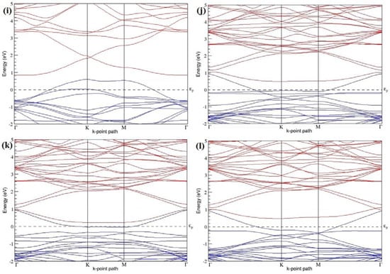Figure 7a–l present the band structures computed for the optimized structures of different B-doped graphene systems shown in Figure 6a–l. As seen in Figure 7a–l, the linear dispersion around the Dirac point is not completely destroyed, but an energy band gap opens in all cases except for graphene doped with two B atoms into the 2 × 2 graphene supercell with dopant atoms at the alternate sublattice points (Figure 7c). The 2 × 2 graphene supercell doped with two B atoms (corresponding to 25% B concentration) shows band gaps of ~0.49 eV (Figure 7a) and ~1.28 eV (Figure 7b) upon placing the B atoms at adjacent and same sublattice positions, respectively, in graphene. B-doped graphene with 25% B concentration has a zero gap (Figure 7c) when the B atoms are at alternate sublattice positions due to the symmetry formed by the B atoms situated in two graphene sublattices (“A” and “B”). At a 6.25% B concentration, band gaps of 0.13 eV (Figure 7g), 0.375 eV (Figure 7h), and ~0.05 eV (Figure 7i) open up in graphene when the B atoms are placed at the adjacent, same, and alternate sublattice positions in graphene, respectively.