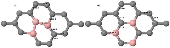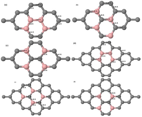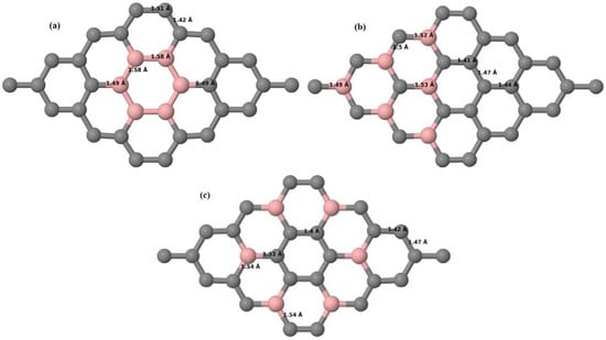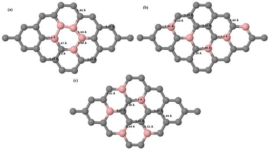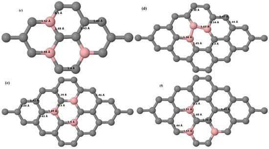 Figure 8a–f present the relaxed geometries of 3 × 3 and 4 × 4 graphene supercells doped with three B atoms at adjacent, same, and alternate sublattices, respectively. After structural optimization, it was found that graphene structures doped with three B atoms at adjacent locations experience significant geometrical distortion (Figure 8a,d) due to the positioning of three B atoms in the same six-membered carbon ring, as compared to the other graphene systems doped with three B atoms. However, the three adjacent B atoms are still seen to lie within the plane with large adjustments in the adjoining bond lengths (Figure 8a,d).