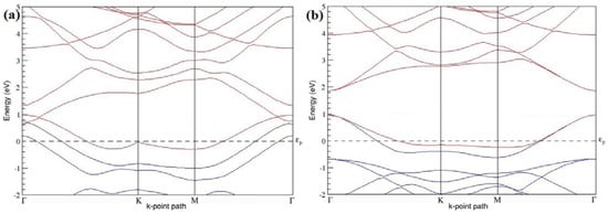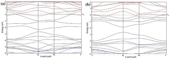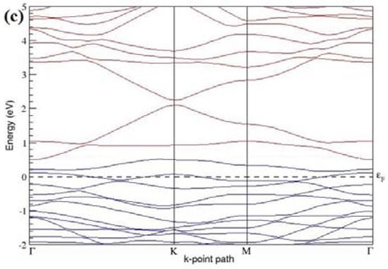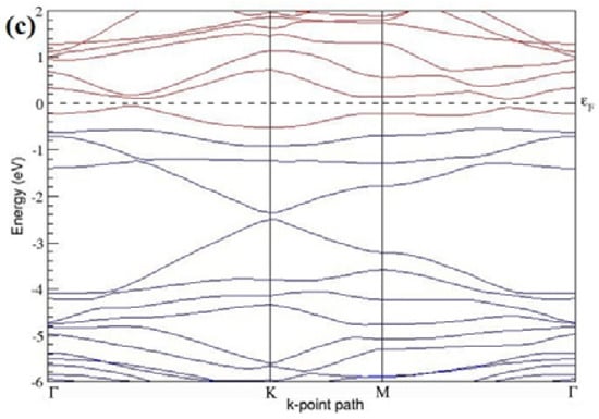 The band structures of all graphene systems doped with six B atoms shown in Figure 15a–c indicate p-type semiconducting behaviors. At a 18.75% concentration, B-doped graphene does not show a band gap (Figure 15a,c) when the B atoms are located at adjacent and alternate sublattice sites, whereas a band gap of ~0.99 eV opens up in graphene (Figure 15b) when the six B dopants are located at the same sublattice sites of graphene, as summarized in Table 6. The observed closed band gap in graphene doped with six B atoms (Figure 15a,c) upon placing the dopants at adjacent and alternate sublattices could be attributed to the symmetry formed by the B dopants in two triangular sublattices [].