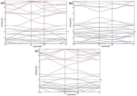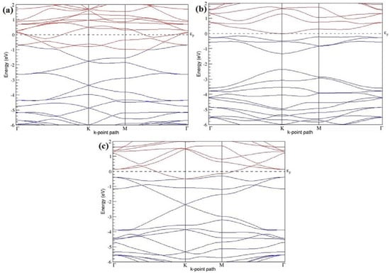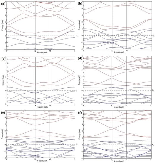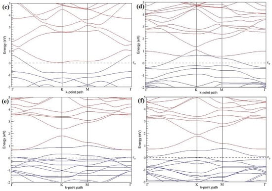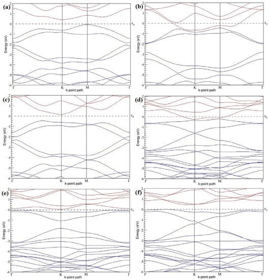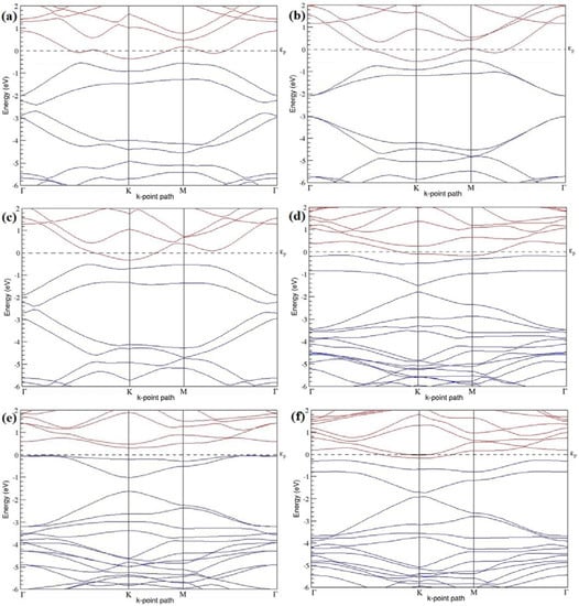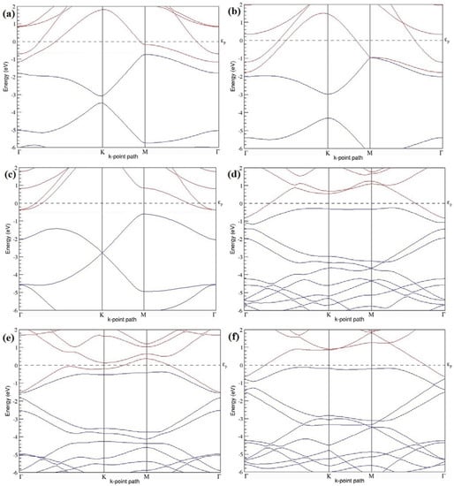 Band structures of graphene systems doped with four B atoms corresponding to the optimized structures shown in Figure 10a–f; (a–c) for 3 × 3 graphene supercell with 22.22% B concentration; (d–f) 4 × 4 graphene supercell with 12.5% B concentration.