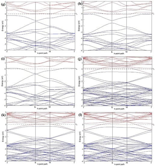 Band structures of graphene systems doped with two B atoms corresponding to the optimized structures shown in Figure 6a–l; (a–c) for 2 × 2 graphene supercell with 25% B concentration; (d–f) 3 × 3 graphene supercell with 11.11% B concentration; (g–i) 4 × 4 graphene supercell with 6.25% B concentration; (j–l) 6 × 6 graphene supercell with 2.78% B concentration.
