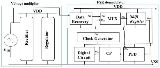 Analog front-end of a RFID tag implementing an amplitude shift keying demodulator. Reproduced with permission from [8], IEEE, 2009.
