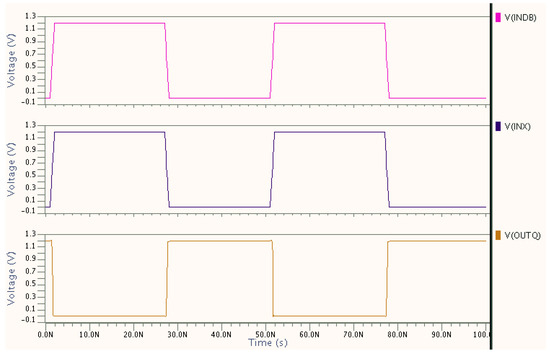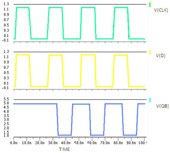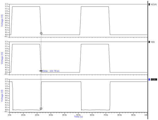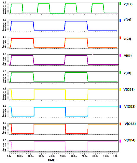 From Table 1, it was determined that the efficiency of the FF can be assessed by calculating its number of transistors, power dissipation, and the delay of the FF. A minimum delay of 102.78 ps and the lowest power dissipation of 7.5499 nW are achieved implementing a conditional transition technique along with four clocked transistors. The power consumption in the proposed FF is significantly lower compared to other designs. Moreover, the proposed FF is designed by integrating fewer transistors among its counterparts in order to avoid circuit complexity.