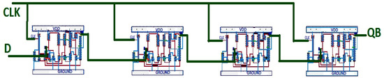 For PIPO shift registers all data bits, including inputs and outputs, perform parallel operations. The interconnected flip-flops are activated by a global clock. In Figure 7, D1, D2, D3, and D4 represent the parallel inputs and the QB1, QB2, QB3, and QB4 represent the parallel outputs. When the register clock is enabled, all input data (D1–D4) appears at the respective output (Q1–Q4) simultaneously. This kind of shift register is used as a temporary storage device or acts as a time delay device. The variation of the clock pulses’ frequency specifies the amount of the time delay. In addition, there are no interconnections in this kind of register between the individual FFs where no serial shifting of data is required. SISO shift registers receive one bit of data at a time in a single line, consecutively. It generates the kept data in the serial form on its output as well. Figure 13 and Figure 14 describe the simulation results for PIPO and SISO shift registers by using 130 nm CMOS technology with a 1.2 V power supply. The PIPO and SISO shift register are implemented integrating the proposed new flip flop and it is found that the performance of the shift register in the case of power dissipation and speed is improved and better compared to other existing designs.