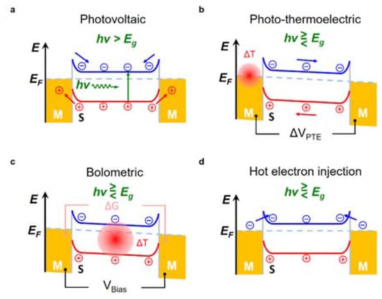 Generally, the photoresponses of 2D material-based devices can be attributed to more than one mechanism when device structures vary or are investigated under different light illumination conditions. Here, several widely studied mechanisms in typical 2D material-based optoelectronics will be described, including photovoltaic effect, photo-thermoelectric effect, photo-bolometric effect, and hot electron injection. Figure 1 summarizes these mechanisms in terms of a typical 2D material-based phototransistor, in which a 2D material thin film bridges two metal electrodes. Here we plot semiconducting 2D material channels rather than semimetal channels to show more comprehensive circumstances. Additionally, photoconductive effect and photogating can also contribute to photocurrent generation [60].