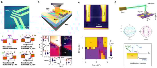 In early studies, the photocurrent generation in 2D materials is attributed to the separation of photon-excited electron-hole pairs (EHPs), usually at PN junctions or metal-semiconductor Schottky barriers, where internal electric fields force the photo-excited EHPs to be separated. This phenomenon is known as photovoltaic effect (PVE), which has been elaborated in traditional 3D semiconductor devices [61,62]. Here we note that photocurrent is defined to be . As shown in Figure 1a, under illumination with photon energy larger than the bandgap of 2D materials, electrons in the valence band can be excited to the conduction band, producing photo-excited EHPs. With the assistance of internal electric fields, excess electrons and holes will be driven to opposite directions, leading to a light-generated current (IL). When the circuit is open, the accumulation of carriers induces a voltage (open circuit voltage Voc), which lowers the potential barrier and generates a forward bias diffusion current that balances the light-generated current. If the external bias is set to be zero, the photo-excited EHPs will be collected, generating a photocurrent (short circuit current Isc). For typical graphene or 2D material-based phototransistors, PVE is thought to be dominant since Schottky barriers usually exist when 2D materials contact metal electrodes. By applying various external gate voltages on an MoS2 device, as illustrated in Figure 2a, the conduction/valence band level of single-layer MoS2 will be tuned accordingly [63]. Thus, the band alignment presents great difference under various gate voltages. Since the band alignment will directly affect the direction and value of the internal electric field, the sign and intensity of PVE-induced photocurrent will change significantly when the gate voltage is sweeping. The drain bias is also very important in terms of PVE since it provides a way to tune the lateral band alignment.