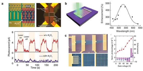 The 2D materials have remarkably high single-pass absorption. However, most light will still transmit through the thin layers as the total thickness is below tens of nanometers. Therefore, the light-matter interactions must be further enhanced before it can be used in practical applications, especially for light detection. The combinations of plasmonic nanostructures with 2D materials are first studied to enhance light-matter interactions. Placing metallic objects by an ordered array with dimension and pitch in the order of the excitation wavelength is a classic way to form plasmonic nanostructures. Either stacking 2D materials on top of those plasmonic nanostructures, or patterning plasmonic nanostructures on top of 2D materials can increase the light absorption at certain wavelengths [93,94,95,96,97]. A significant enhancement ~65% of photoluminescence intensity are reported for a monolayer MoS2-coated gold nanoantennas system [98]. Similar phenomena are observed for 2D material base optoelectronics. A large enhancement of photocurrent response can be obtained by coupling few-layer MoS2 with Au plasmonic nanostructure arrays [99]. Depositing 4 nm thick Au nanoparticles sparsely onto few-layer MoS2 phototransistors leads to a two-fold increase in the photocurrent response. To further enhance the photocurrent response, well-defined periodic Au nanoarrays are synthesized on few-layer MoS2. Under this circumstance, a three-fold enhancement is achieved, which is attributed to the light trap near the Au nanoplates. On the other hand, a direct contact between 2D materials and metals enables hot electron injection over Schottky barriers [100]. A bilayer MoS2 film has been integrated with a plasmonic antenna array as shown in Figure 3a. With the assistance of hot electron injection, a photoresponsivity of 5.2 A/W has been achieved under 1070 nm illumination, and a photogain is estimated to be ~105. No noticeable photocurrent signals are observed if an Al2O3 barrier exists between the MoS2 film and Au array, suggesting that hot electron injection indeed plays a dominant role in the photocurrent generation. Similar phenomena are observed for graphene. In Figure 3b, gold nanoparticles are transferred onto pre-prepared graphene transistors [101]. Here, the plasmonic nanostructures can be treated as subwavelength scattering sources and nanoantennas to enhance the optical detection and photoresponse at selected plasmon resonance frequencies. For this metallic plasmonic nanostructure-integrated graphene photodetector, a huge enhancement of photocurrent and external quantum efficiency up to 1500% has been achieved. By employing plasmonic nanostructures of different geometries, graphene photodetectors present not only enhanced responsivity but also selectivity of polarization [102]. As shown in Figure 3c, by combining graphene with plasmonic nanostructures, the efficiency of graphene-based photodetectors can be increased by up to 20 times. Moreover, for the special finger plasmonic nanostructure, the photocurrent signals show strong polarization dependency.