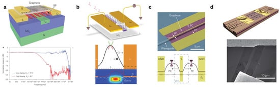 The combination of photonic structures like waveguides, resonators or cavities with 2D materials enables the achievement of electro-optic modulator by electrostatically tuning 2D materials. A graphene-based broadband optical modulator is fabricated by placing a 250 nm-thick Si bus waveguide underneath a graphene sheet as illustrated in Figure 5a [107]. A 7 nm-thick Al2O3 spacer is placed between Si and graphene. The integration introduces several performance improvements: graphene provides strong light-matter interactions and broadband response covering telecommunication bandwidth, as well as mid- and far-infrared spectral regions. Furthermore, modulation of the guided light at frequencies over 1 GHz is demonstrated by electrically tuning the Fermi level of the graphene. Ring-shaped silicon microring resonators have also been reported to be combined with the graphene transistor as displayed in Figure 5b [108]. By tuning coverage lengths and electrostatic biases of graphene, a high extinction ratio of 12.8 dB is achieved. Photonic crystals are another extensively studied field to form various optical modulators such as resonators and cavities as the flow of light can be precisely molded. Photonic crystals are analogous to crystals where the unit structure is periodically duplicated [44,45,46]. When the periodicity in these structures approaches the wavelength of light, a photonic bandgap, in which the light propagation is forbidden, will appear. Under this circumstance, a pre-designed break in periodicity will introduce confinement of light. Photonic crystal/2D material hybrid systems are also reported in previous literatures [108,109,110,111,112,113]. Gan et al. have employed linear three-hole defect cavities in air-suspended 2D photonic crystals with graphene thin films transferred to the top [109]. The reflection attenuation and the increase of Raman signal intensity have demonstrated the local enhancement of light-matter interactions. Photonic crystals have also been reported to be integrated with 2D material phototransistors [110,111]. As shown in Figure 5c, optical cavities are fabricated by introducing point defects into 2D silicon photonic crystals [110]. The electrostatic properties of graphene are tuned by either source-drain biases or an ion-gel gate; as a result, a ~2 nm change in the cavity resonance line width and almost 400% (6 dB) modulation in resonance reflectivity are observed. Similar phenomena are reported for line defect photonic crystals [111].