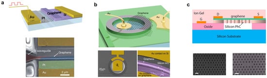 - Gan, X.; Shiue, R.-J.; Gao, Y.; Mak, K.F.; Yao, X.; Li, L.; Szep, A.; Walker, D.; Hone, J.; Heinz, T.F.; et al. High-contrast electrooptic modulation of a photonic crystal nanocavity by electrical gating of graphene. Nano Lett. 2013, 13, 691–696. [Google Scholar] [CrossRef] [PubMed]