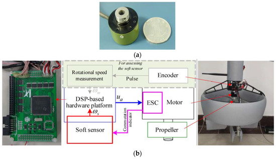 The software of the soft sensor runs on a DSP-based hardware platform (TI TMS320F28335), which is good at processing complex numeral calculations and providing accurate time information. The ESC of the motor can send a trigger signal to the soft sensor at the commutation instant. A subminiature, high-resolution rotary encoder with a resolution of 20″, shown in