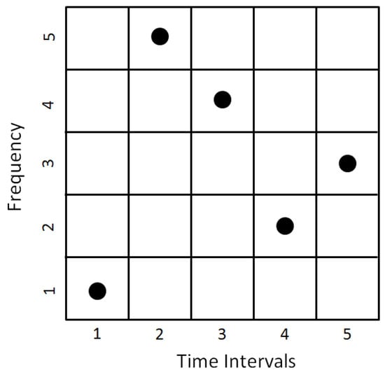 In the case of a frequency-hopped radar, the signal consists of frequencies chosen from a set of available frequencies spanning the range , where is the bandwidth and is the frequency spacing, i.e., where k is an integer and . These frequencies are transmitted at each of a set of consecutive time intervals, where is the total signal duration and is the time step or the sub-pulse duration, where [11]. Optimum resolutions in both range and Doppler require [12]. Such a signal can be represented as an matrix shown in Figure 1 where the n vertical rows correspond to the n frequencies and the n horizontal columns correspond to the n time intervals. The matrix entry equals one if and only if frequency is transmitted in time interval ; otherwise . Allowing the frequencies to increase or decrease in a linear order over the various time slots would result in a Linear Frequency Modulation (LFM) waveform instead of a more disordered frequency-hopped waveform.