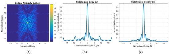 Sudoku auto-ambiguity plots: (a) 2D ambiguity surface; (b) zero-delay cut of the Sudoku puzzle; (c) zero-Doppler cut of the Sudoku puzzle.