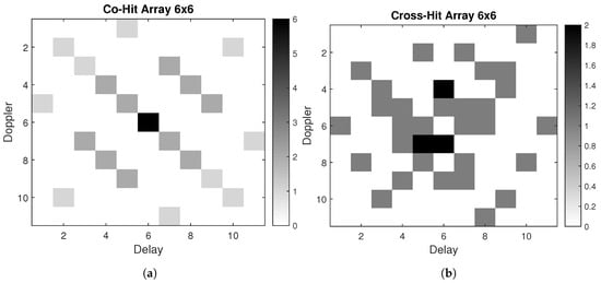 The auto-coincidence matrix or co-hit array is computed by correlating the binary frequency matrix with itself, while the cross-coincidence or cross-hit array is computed by correlating two different frequency codes with each other. By examining the resulting hit array matrices and sorting the resulting collisions in order from greatest to least, we can investigate how well these codes perform. Finding the second highest number of collisions in the co-hit array will give the expected side-lobe performance of that particular code, while the highest number of collisions given in the cross-hit array will give the highest side-lobe coincidence for interference. An example of the coincidence arrays is given in Figure 4.