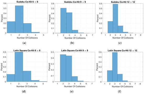 Histogram of co-hit array collisions: (a) Sudoku; (b) Sudoku; (c) Sudoku; (d) Latin square; (e) Latin square; (f) Latin square.