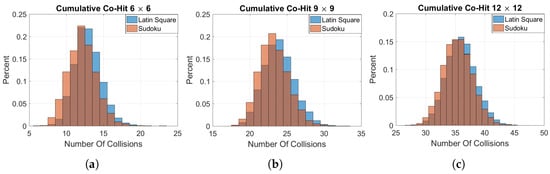 Cumulative co-hit histograms of Sudoku and Latin squares: (a) order ; (b) order ; (c) order .