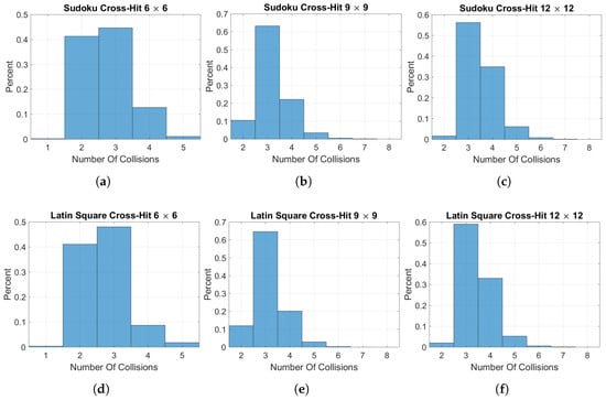 Histogram of cross-hit array collisions: (a) Sudoku; (b) Sudoku; (c) Sudoku; (d) Latin square; (e) Latin square; (f) Latin square.