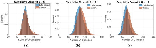 Cumulative cross-hit histograms of Sudoku and Latin squares: (a) order ; (b) order ; (c) order .