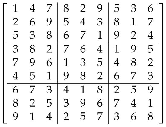 Sudoku is a combinatorial number-placement puzzle that has its roots in the well-studied Latin squares [1]. A Latin square is comprised of an grid in which each column and row contains all of the integers from one to n. Sudoku has the additional constraint that the same integer appears only once in the same row, column or any of the n sub-grids of size of the grid. The box constraint serves to increase its Shannon entropy (measure of the disorder of a typical matrix) as compared to cases without the constraints imposed, i.e., for randomly-generated matrices of the same size [2]. The most recognizable Sudoku puzzle is the popular variant, where and . However, puzzle sizes as large as have been realized. While the square and rectangular sub-grids within a Sudoku-type puzzle are the most common arrangement, other irregular geometries exist, where the integers one through n have to fit more esoteric shapes [3]. Mutually-orthogonal Sudoku squares have also been constructed and studied [4,5]. Sudoku squares are classified as mutually orthogonal if two squares of the same order n can be overlayed on top of one another and produce distinct pairs of numbers. Specifically, if and are prime, a set of mutually-orthogonal Sudoku squares can be constructed. Thus, there are six mutually-orthogonal realizations for the popular Sudoku puzzle.