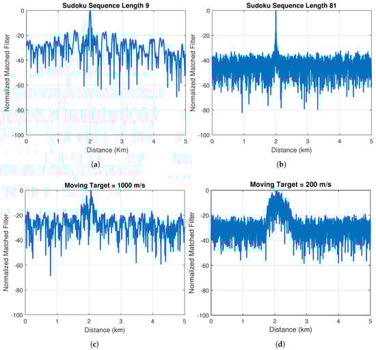 Normalized matched filter output for Sudoku sequences: (a) length nine Sudoku sequence and a single stationary target located 2 km; (b) length 81 Sudoku sequence and a single stationary target located 2 km; (c) length nine Sudoku sequence with a target moving at 1000 m/s; (d) length 81 Sudoku sequence with a target moving at 200 m/s.