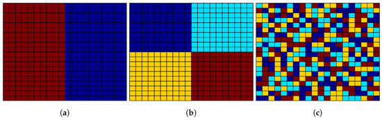 This section explores two applications of Sudoku puzzles to antenna arrays through interleaving of the elements: (1) main beam steering in multiple directions using a fraction of the array elements; and (2) the generation of simultaneous multiple beams. Array interleaving has been studied previously [16] and is of interest when multiple arrays have to share the same area. Multiple arrangements can be made to have arrays that operate at the same frequency, as shown in Figure 13. Figure 13a shows two arrays positioned side-by-side; Figure 13b shows an arrangement for four arrays; and Figure 13c shows a Sudoku-based interleaving for four arrays. The non-interleaved arrays have better side-lobes, but the interleaved arrays offer narrower beamwidths [16]. The array factor for planar arrays is given by [17]: