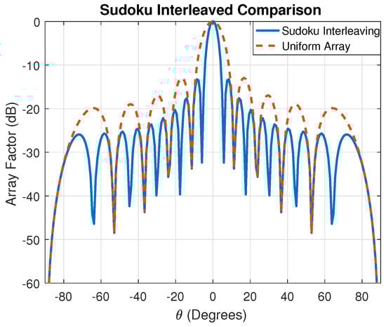 We next compare the ideal scenarios using two approaches: the first utilizing Sudoku puzzles, while the second being formed by a random permutation of the array elements. The results of the Sudoku and random permutation for a single main beam are shown in Figure 16. The results are normalized to the ideal cases in Figure 15 and, therefore, will have a maximum value lower than 0 dB due to the fraction of elements used. We observe both the Sudoku- and random-based steering result in very similar array factors. The main beam is approximately 12 dB lower than the ideal case and has side-lobes mostly 10 dB below the peak value.