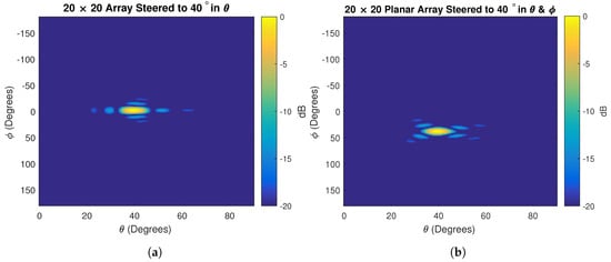 First, we only consider a single main beam, which is steered to in the θ direction, as well as a single beam steered to in both the θ and ϕ directions. The ideal case in which all elements are turned on is shown in Figure 15.