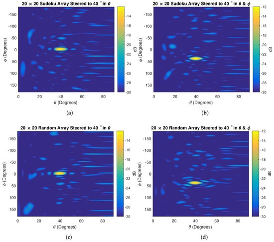Single beam steering: (a) Sudoku-based steering for a main beam of in the θ direction; (b) Sudoku-based steering for a main beam of in both the θ and ϕ directions; (c) random-based steering for a main beam of in the θ direction; (d) random-based steering for a main beam of in both the θ and ϕ directions.