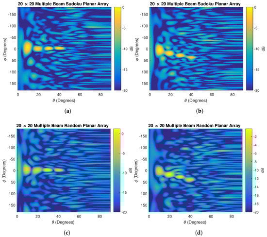 Next, we examine the scenario in which all of the elements are turned on. Therefore, the resulting array factor will have four main beams at the assigned phases given in Table 4 for the case of either the θ direction or θ and ϕ directions. The results for the Sudoku and random multiple beam scenario are shown in Figure 17. The random permutation is normalized to the Sudoku results; therefore, we see that the largest value in the random array is larger than 0 dB. While both scenarios show the main beams, the Sudoku-based approach appears to have a more uniform amplitude across the different beams, while the random case has less uniformity across the beams.