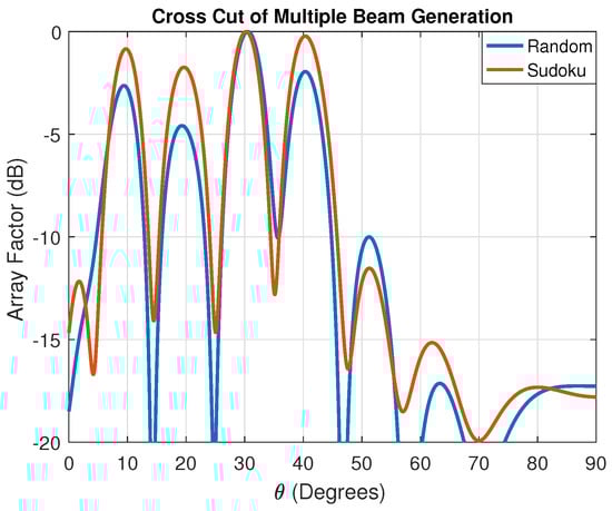 We can examine this more closely in Figure 18, which shows a two-dimensional cross-cut of the two array factors for . We can see that indeed the random array does not provide as even an amplitude distribution across the four beams. Obviously, using the random approach, the resulting beam amplitudes could change drastically from each iteration depending on how the element phases get assigned. The Sudoku interleaving approach based on the row, column and box constraints provides a more even spread of the phases across the array, so that a single area of the array is not dominated by a particular phase.