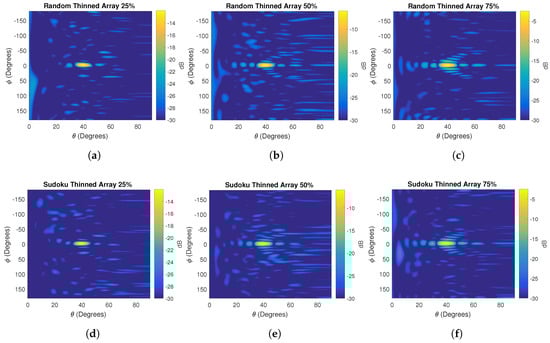 The Sudoku array thinning was compared to random thinning for thinned percentages of 25%, 50% and 75% in Figure 19 with the main beam scanned to . The resulting thinned arrays are normalized with respect to the maximum of the ideal array factor in Figure 15a. The results are shown as two-dimensional images with ϕ on the y-axis ranging from degrees and θ on the x-axis ranging from degrees.