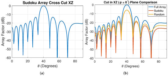 Cross-cut of the scanned planar array: (a) thinned Sudoku array cross-cut in the XZ plane; (b) comparison of the Sudoku- and randomly-thinned array factor to that of an array with all of the elements turned on.