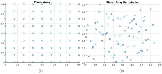 Array topology: (a) planar array with spacing corresponding to 2 GHz; (b) planar array with Sudoku-based perturbations.